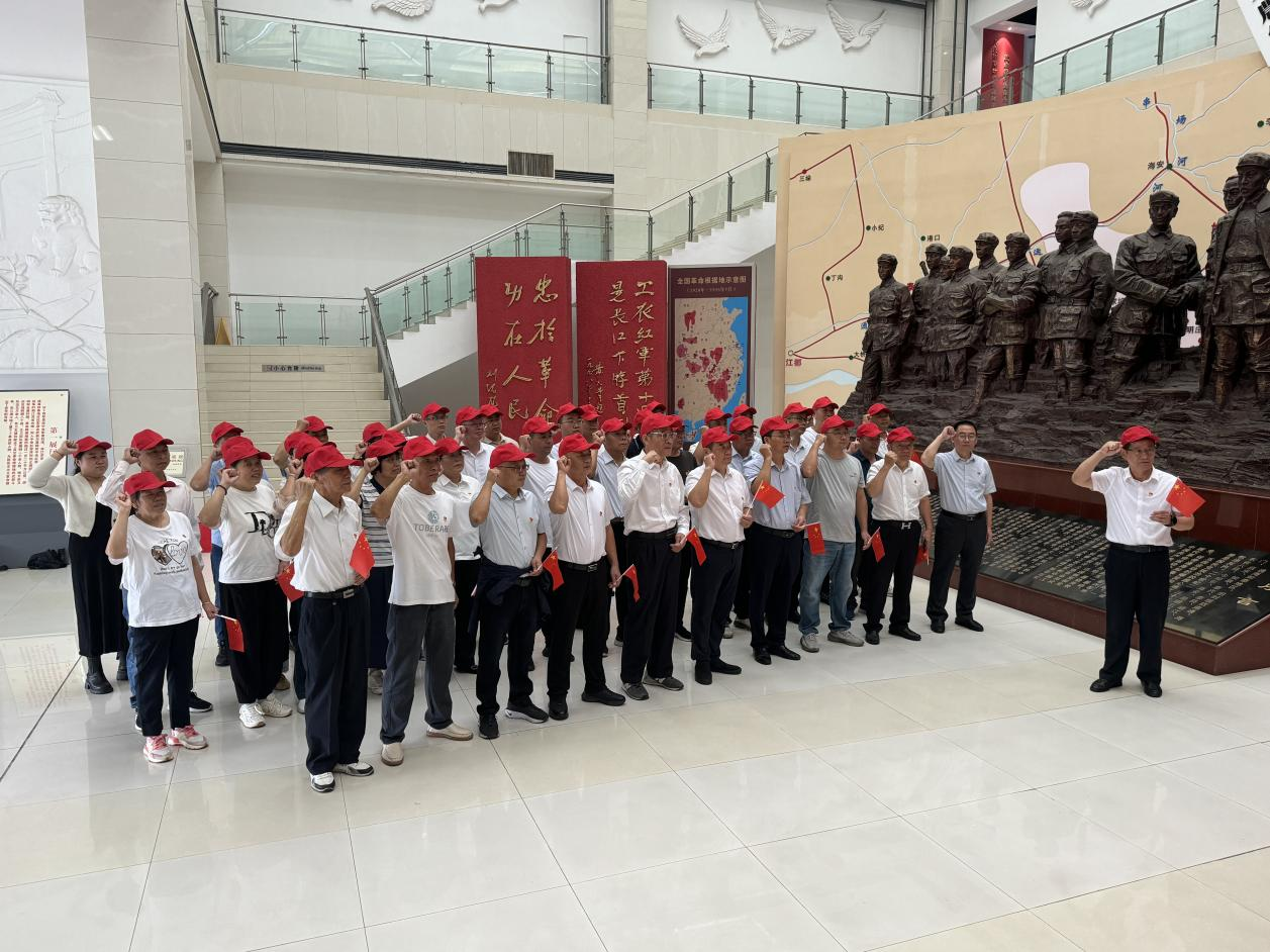在纪念馆,全体党员整齐列队,面向鲜红的中国共产党党旗,举起右拳,庄严重温入党誓词。“我志愿加入中国共产党,拥护党的纲领,遵守党的章程……”铿锵有力的誓言回荡在场馆上空,不仅是对入党初心的深刻回望,更是对传承革命精神、践行使命担当的郑重承诺。随后,全体党员在纪念馆前集体合影,定格下这一意义非凡的时刻。