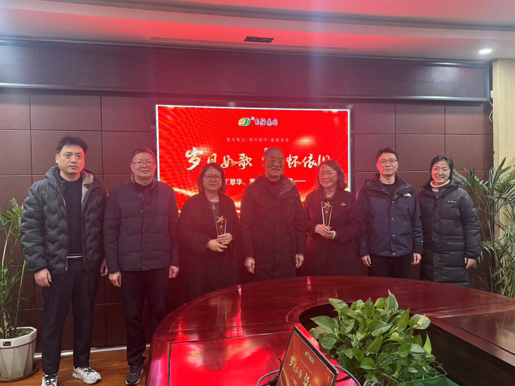 座谈会尾声,顾云飞董事长亲自为丁翠华、季红菊两位同志颁发了刻有专属荣誉的纪念奖杯,奖杯承载着集团对她们数十年奉献的高度认可与深切敬意。全体与会人员共同合影留念,镜头定格下这一温馨难忘的时刻,将同事间的深厚情谊与企业的人文关怀永久留存。